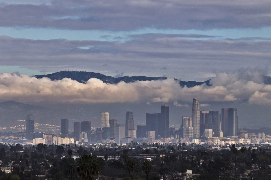 The San Gabriel Mountains are seen in the background during cloud cover over the Los Angeles skyline on January 26, 2013. REUTERS/Adrees Latif (UNITED STATES - Tags: ENVIRONMENT CITYSCAPE TPX IMAGES OF THE DAY) - RTR3D0DJ