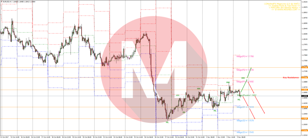 Jika bearish target terhampir adalah MagicS1 1.1614/00 atau ke MagicS2 hari ini iaitu 1.1580 ataupun berkemungkinan akan mencapai ke harga yang lebih rendah iaitu 1.1550. Walaubagaimanapun, jika ia breakout 1.1700, EUR/USD berkemungkinan akan mencapai ke resistance seterusnya 1.1730.