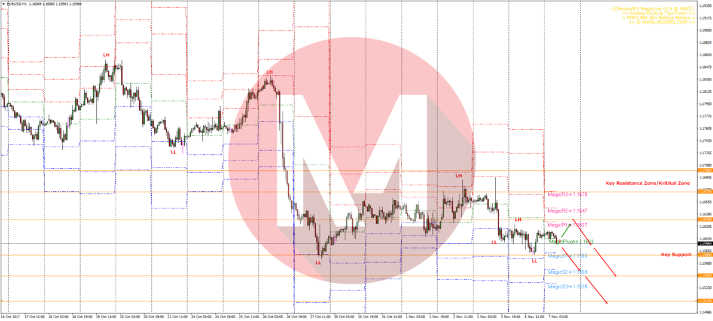 Dan sekiranya EUR/USD melakukan retracement, harga sekitar MagicR1 1.1630 adalah harga yang berpotensi untuk dicapai sebelum ia bearish. Jadi kesimpulannya,secara teknikal selagi EUR/USD tidak breakout Key Resistance zone, mood bearish masih dikuasai ketika ini.