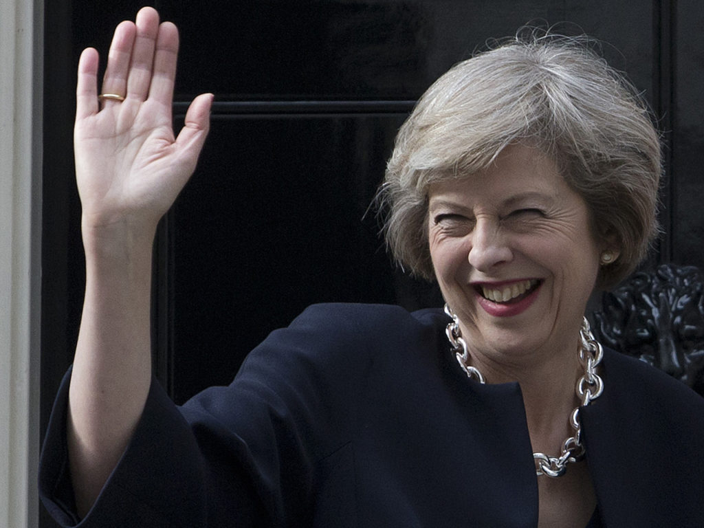 TOPSHOT - Britain's new Prime Minister Theresa May waves outside 10 Downing Street in central London on July 13, 2016 on the day she takes office following the formal resignation of David Cameron. Theresa May took office as Britain's second female prime minister on July 13 charged with guiding the UK out of the European Union after a deeply devisive referendum campaign ended with Britain voting to leave and David Cameron resigning. / AFP / JUSTIN TALLIS (Photo credit should read JUSTIN TALLIS/AFP/Getty Images)