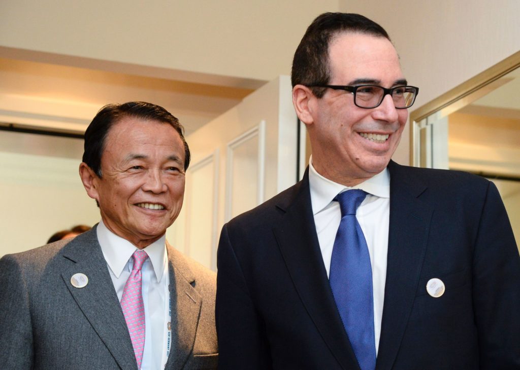 Menteri Kewangan Jepun, Taro Aso dan Setiausaha Perbendaharaan AS Steve Munchin dikatakan akan bertemu pada Khamis bagi mengadakan mesyuarat dua hala. Perbincangan tersebut dikatakan akan dijalankan di luar perhimpunan pemimpin kewangan G20 yang dijadualkan berlangsung di Washington DC pada Isnin.