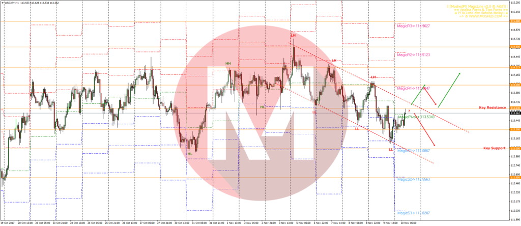 Jika USD/JPY breakout harga 113.64 iaitu Key Resistance harian/trendline ini, ia berpotensi tinggi untuk mulai bullish dan target yang akan dicapai adalah sekitar MagicR1 atau ke harga yang lebih tinggi lagi. Tetapi sekiranya ia gagal untuk breakout, USD/JPY akan bearish pada hari ini dan mencapai semula harga di sekitar MagicS1 iaitu Key Support harian 113.00.