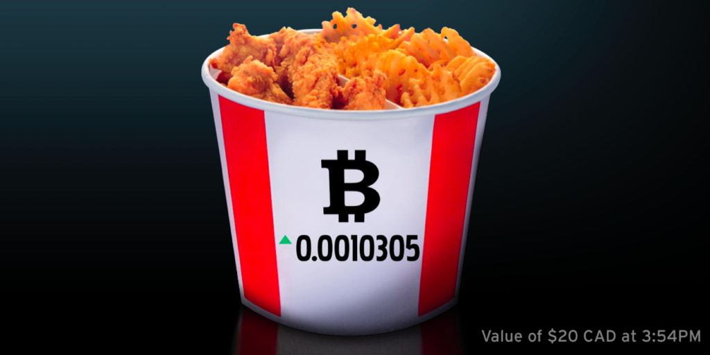KFC sebuah rangkaian restoran makanan segera terkemuka dunia menerima Bitcoin sebagai medium pembayaran untuk tempoh yang terhad di Kanada. Kempen pemasaran yang bermula pada 12 Januari itu menunjukkan KFC cawangan Kanada memperkenalkan ‘bitcoin bucket’ yang berharga CAD$20.