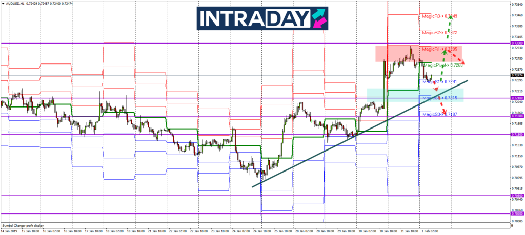 Pada sesi pasaran Asia hari ini, harga dilihat menyambung semula penurunan pada sesi sebelumnya dan turun lebih rendah dari paras Magic Pivot 0.7268 hari ini. Harga kemudian turun lebih rendah lagi sehingga ke paras support 0.7241 (MagicS1) hampir menjelang pembukaan sesi pasaran Eropah. Jika harga meneruskan penurunan, harga bakal menguji paras tumpuan di sekitar 0.7215 (MagicS2) yang dilihat sebagai zon RBS (resistance become support). Dan sekiranya harga berjaya tembusi zon tersebut, jangkaan paras support pada 0.7187 (MagicS3) bakal menjadi destinasi tumpuan harga seterusnya.