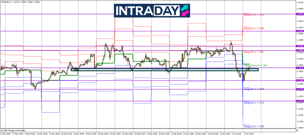 Pergerakan harga dalam pasaran pada dagangan semalam agak mengejutkan di mana perbezaan jarak pergerakan yang besar berlaku pada pasangan matawang-matawang utama terutamanya EUR/USD. Data perkilangan di zon Eropah secara keseluruhannya ditafsirkan sebagai bacaan yang lemah telah menyumbang kepada penurunan harga pada chart EUR/USD. Harga pada mulanya menunjukkan kenaikan pada sesi pasaran Asia sehingga ke paras resistance MagicR2 pada indicator Moshed Magic Line semalam, namun harga kemudian dilihat telah menjunam 170 pips sehingga melepasi ketiga-tiga paras support dan juga paras tumpuan harga di 1.13700. Paras terendah harga pada terjunan semalam mencecah sehingga ke paras sekitar 1.3250.