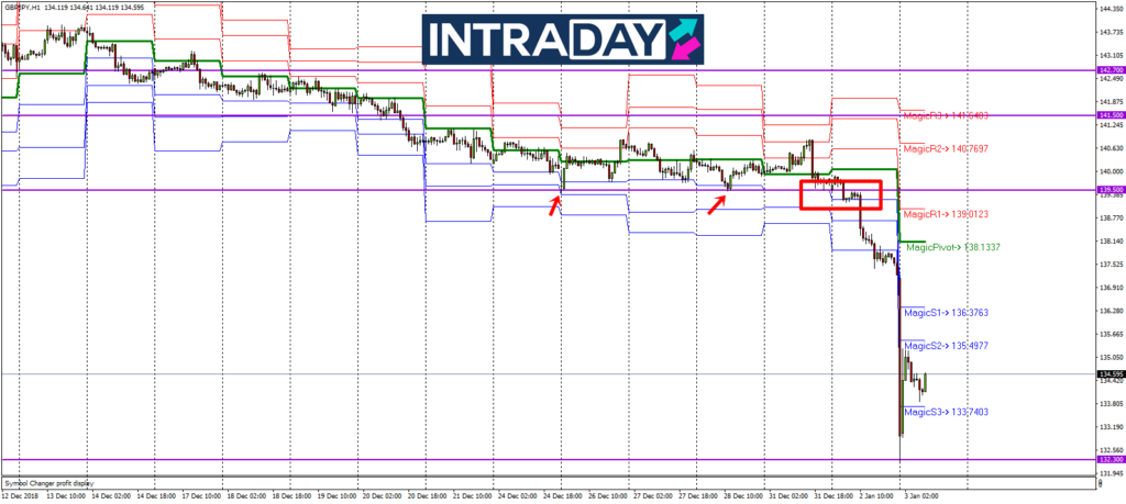 Pasangan matawang Sterling dan Yen dilihat antara kombinasi yang menjadi kegemaran untuk sesi dagangan semalam. Sterling yang didagangkan berisiko terus menerima tekanan daripada pengukuhan ketara Yen didorong oleh faktor sentimen pasaran yang kekal berisiko. Dilihat pergerakan awal harga pada chart pasangan matawang GBP/JPY semalam, harga telah breakout paras support 139.500 dan menuju ke paras support MagicS1. Seterusnya harga dilihat terus menyambung penurunan sehingga melepasi paras support MagicS3 pada indicator Moshed Magic Line semalam.