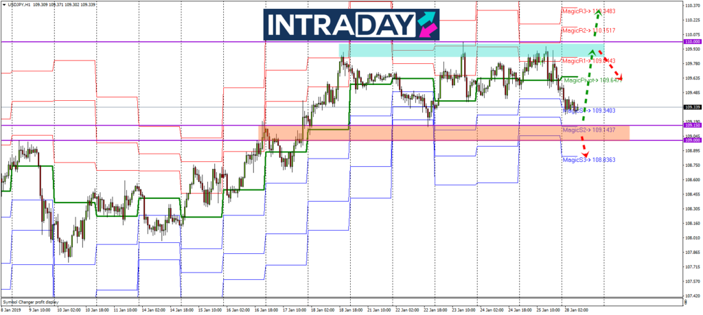 Pada sesi pasaran Asia dagangan Isnin pula, harga yang memulakan dagangan lebih rendah dari paras Magic Pivot 109.647 hari ini menunjukkan penurunan harga sehingga ke paras support 109.340 (MagicS1) dan menguji paras tersebut sehingga menjelang pembukaan sesi pasaran Eropah. Jika harga kekal meneruskan penurunan, harga kemudiannya dilihat akan menuju pula ke paras sekitar support 109.143 (MagicS2) untuk harga menguji paras terendah dagangan minggu lalu yang turut dilihat berada pada zon RBS (resistance become support). Sekiranya harga masih mengekalkan momentum penurunan tersebut, harga bakal mencecah penurunan ke paras sekitar 108.836 (MagicS3).