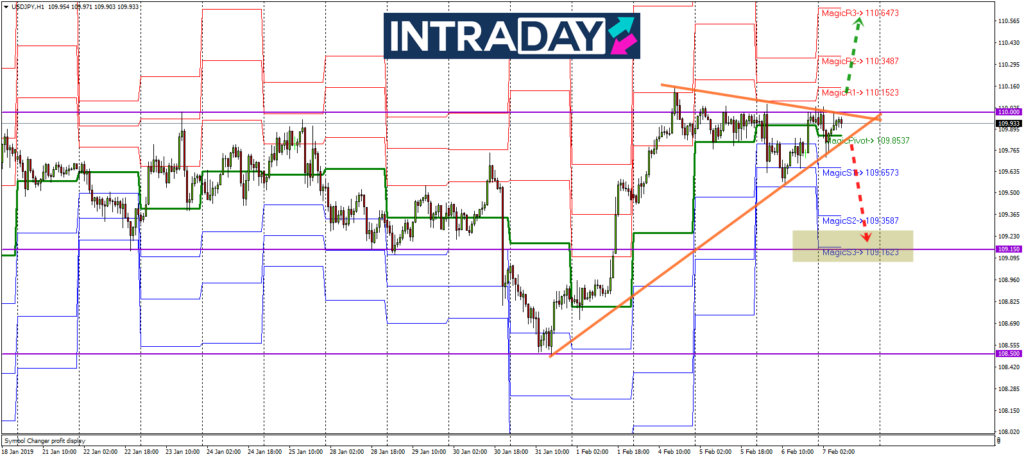 Namun jika harga kembali turun lebih rendah semula dari paras Magic Pivot 109.853, paras awal penurunan harga dilihat akan menuju ke paras 109.657 (MagicS1). Seterusnya, harga bakal menyambung penurunan ke paras lebih rendah dan menguji pula support pada 109.358 (MagicS2). Sedikit lagi penurunan harga akan menguji pula zon major support pada chart USD/JPY iaitu pada paras 109.162 (MagicS3) dan pelabur akan turut menunggu reaksi harga pada paras tersebut.