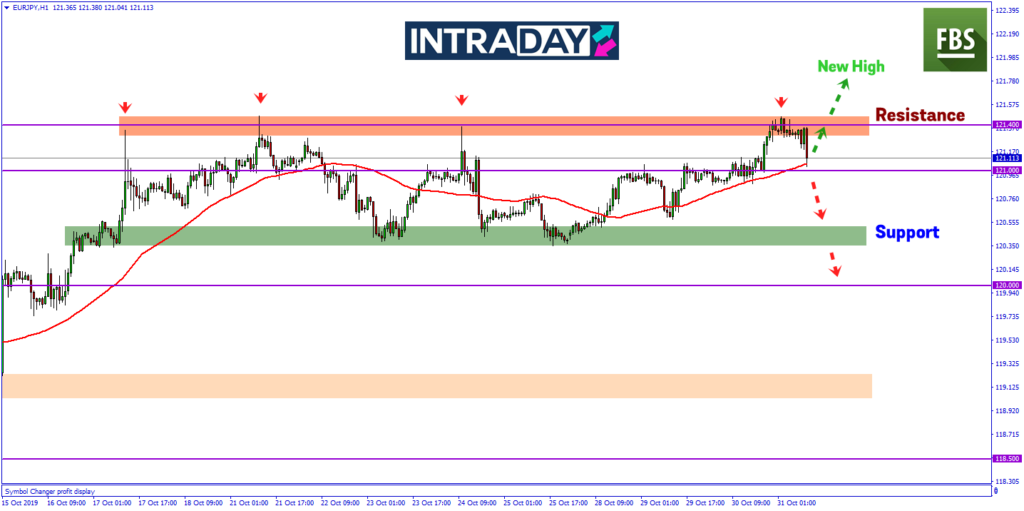 Meneliti pergerakan harga pada carta pasangan matawang EUR/JPY, harga yang membuat kenaikan semalam menguji zon resistance pada ketinggian harga 121.400 pada penghujung sesi New York dan juga pada sesi Asia hari ini. Namun harga gagal menembusi zon resistance tersebut sebelum membuat penurunan semula.
