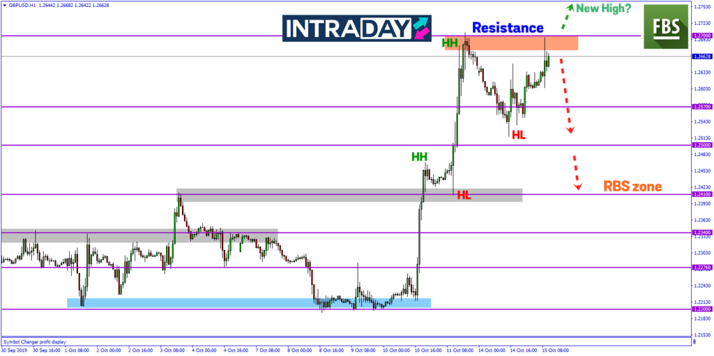 Paras resistance pada 1.27000 menjadi penanda aras ketinggian semasa bagi harga pada dagangan GBP/USD. Jika harga dilihat gagal melepas paras resistance tersebut, dan perkembangan isu Brexit yang kembali goyah, bakal mempamerkan terjunan harga berkemungkinan 500 pips ke paras rendah semula.