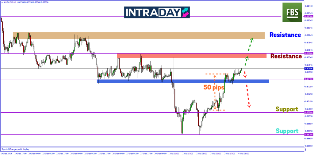 Kenaikan harga sehingga 50 pips yang ditunjukkan pada dagangan AUD/USD semalam telah berjaya melepasi zon support become resistance (SBR) pada 0.6745 dan kelihatan pergerakan harga masih menuju ke arah lebih tinggi.