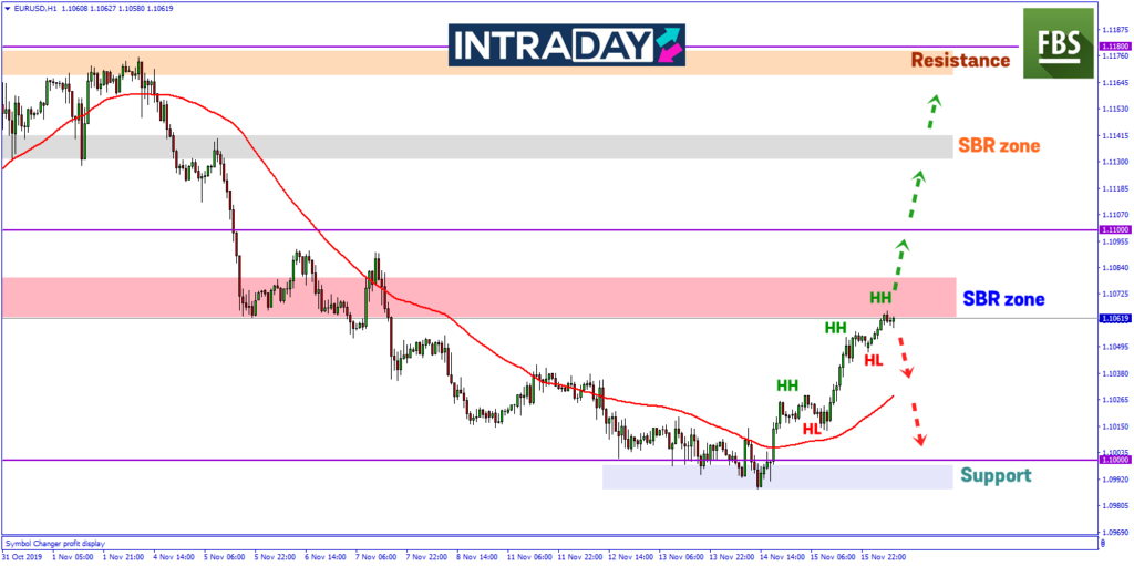 Bersambung pada sesi pasaran Asia hari ini, harga meneruskan kenaikan menuju zon SBR (support become resistance) sekitar 1.10600 dengan pergerakan harga yang perlahan.