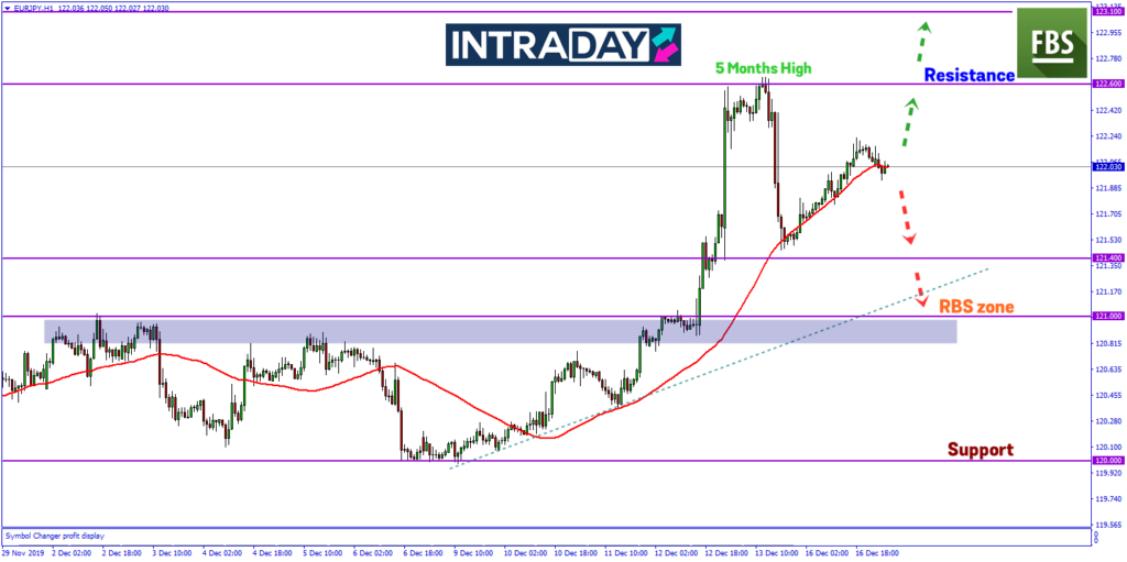 Harga berkemungkinan mencatatkan paras ketinggian terbaru mencapai paras 123.100 yang berada pada zon resistance harga pada dagangan Jun dan Julai sebelum ini. Paras ini juga dilihat sebagai zon SBR (support become resistance) utama pada carta EUR/JPY.