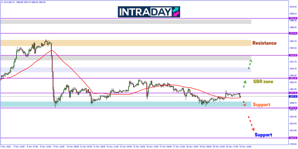 Sekiranya harga turun lebih rendah, zon support 1850.00 akan kembali diuji di mana masih menjadi paras sokongan harga sejak beberapa minggu yang menghalang harga emas jatuh lebih rendah.