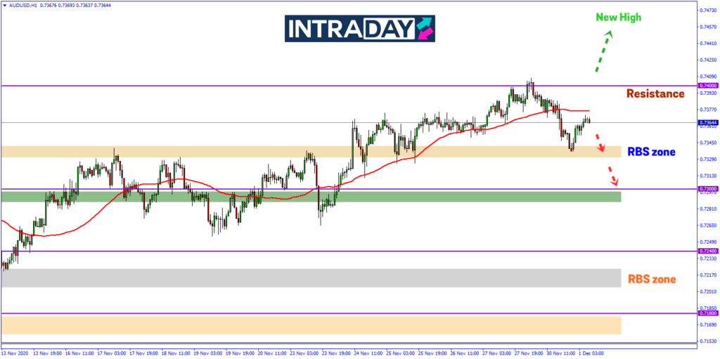 Penurunan harga telah kembali menguji zon RBS (resistance become support) 0.73400 sebelum kenaikan pada sesi Asia pagi ini.