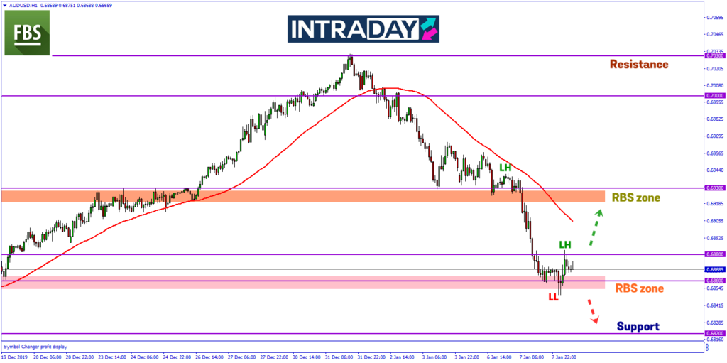 Jika sentimen pasaran kekal berisiko harga dijangka akan turun lebih rendah berkemungkinan menuju zon RBS (resistance become support) di paras 0.68200.
