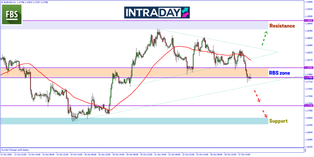 Pada carta harga pasangan mata wang EUR/USD, harga telah membaut penurunan semula ke bawah paras tumpuan 1.18000 pada zon RBS (resistance become support) tersebut.