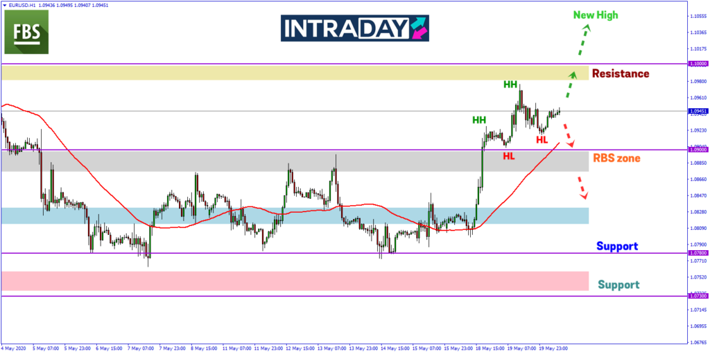 Namun jika harga membuat penurunan, paras sokongan dinamik Moving Average 50 (MA50) akan diuji sebelum harga menguji pula zon RBS (resistance become support) sekitar 1.09000.