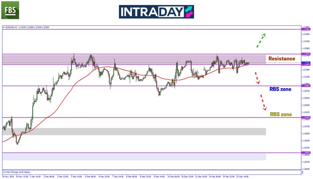 Namun jika harga menjunam dari zon resistance semasa, jangkaan awal terhadap trend bearish harga pada carta EUR/USD akan melihatkan harga menguji zon RBS (resistance become support) sekitar 1.20900.