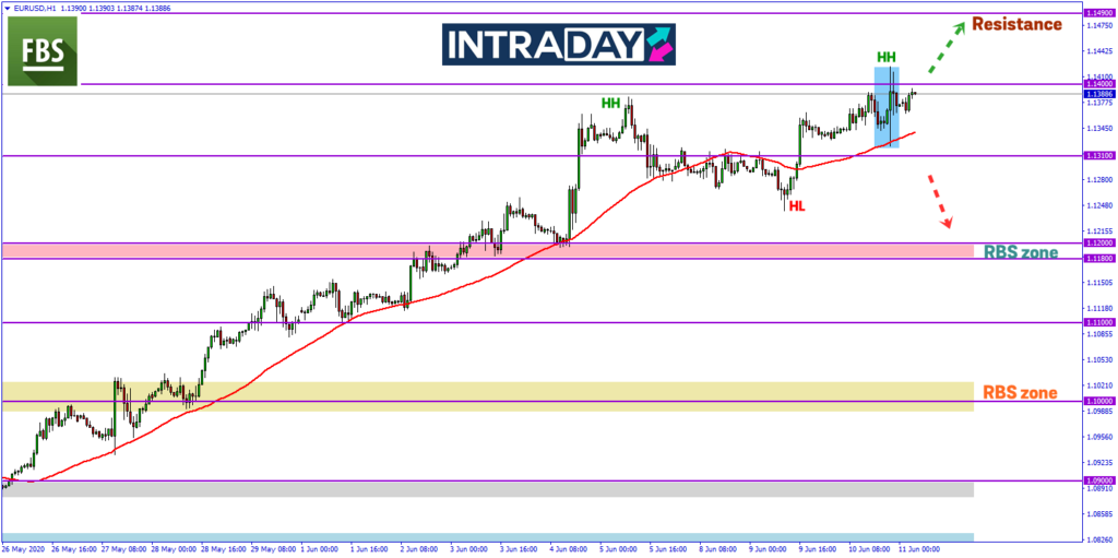 Harga pada mulanya membuat penurunan menguji paras sokongan Moving Average 50 (MA50) pada rangka masa 1 jam pergerakan harga. Namun kembali melonjak semula sebelum menembusi paras resistance 1.14000.