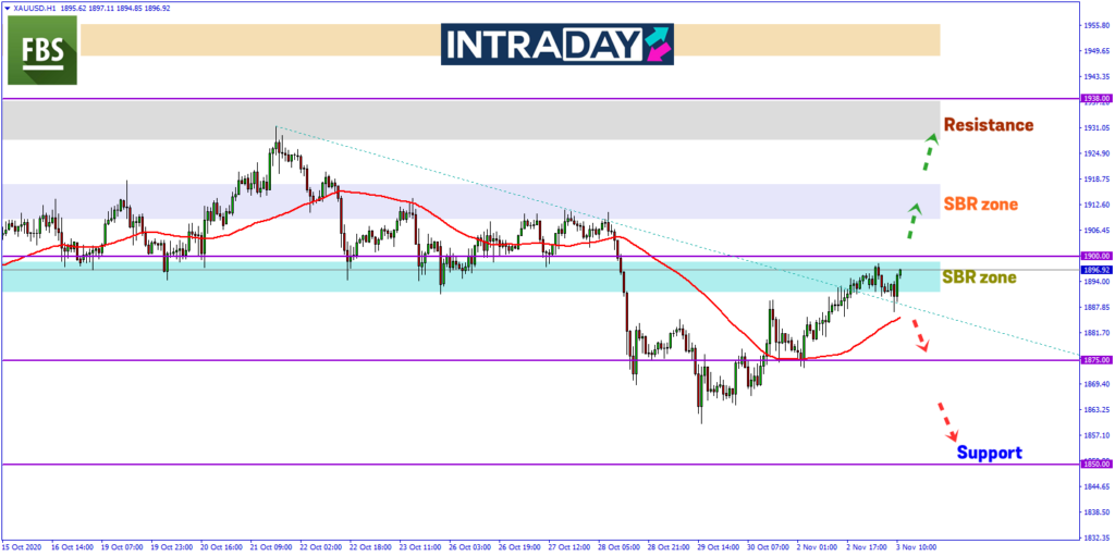 Diperhatikan pergerakan harga emas pada carta XAU/USD, harga telah meningkat dari paras sokongan 1875.00 di awal sesi Asia semalam menuju ke paras penting 1900.00 di zon SBR (support become resistance).