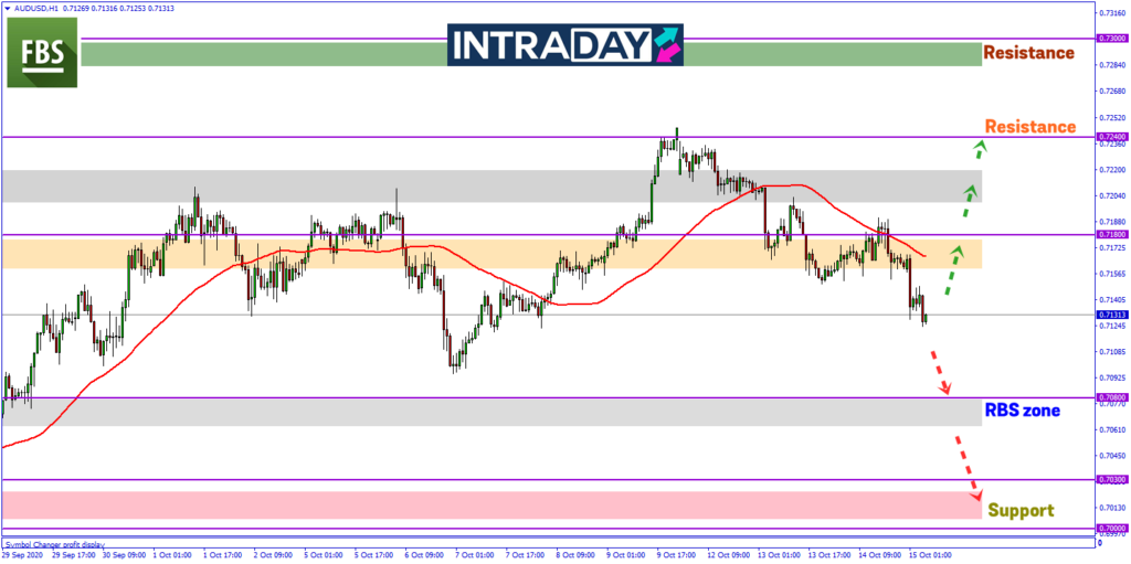 Dengan tekanan terhadap matawang Aussie, harga dijangka akan turun lebih rendah menuju zon RBS (resistance become support) sekitar 0.70800.