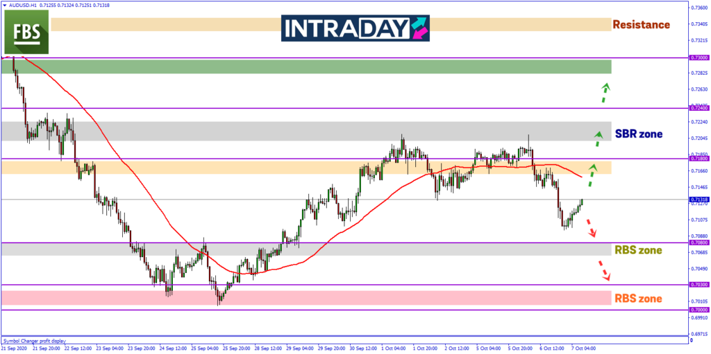 Harga pada carta AUD/USD kembali membuat kenaikan dari paras 0.71000 ke paras 0.71300 menguji zon minor SBR (support become resistance).