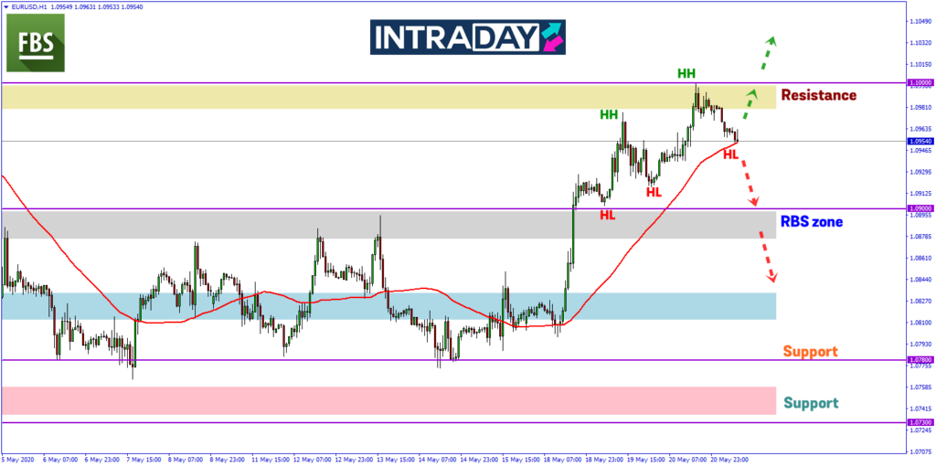 Jika penurunan harga lebih rendah di bawah MA50, harga akan memberi isyarat awal perubahan trend bearish dan akan menuju zon RBS (resistance become support) pada 1.09000.