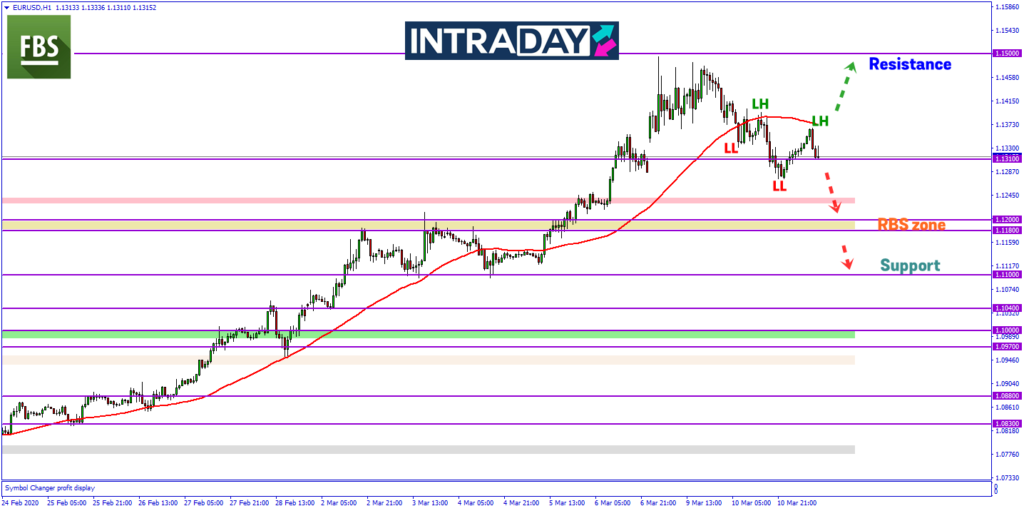 Jika harga meneruskan penurunan melepasi paras terendah harian semalam, penurunan seterusnya dilihat akan menuju zon RBS (resistance become support) sekitar paras 1.12000. Penurunan lebih rendah akan menguji pula paras 1.11000.