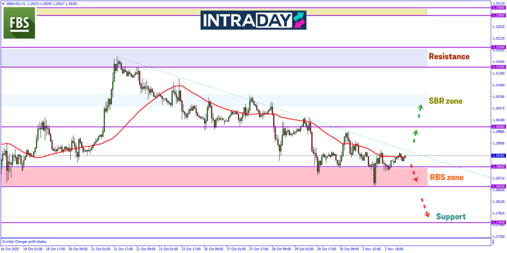 Jika arah pergerakan harga kekal menurun, zon RBS dengan paras sokongan 1.28500 akan ditembusi sebelum harga menuju zon support lebih rendah pada 1.27600.
