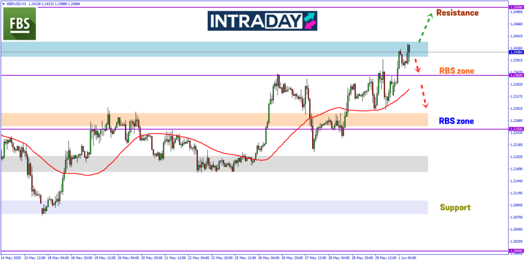Sebaliknya jika harga kembali membuat penurunan semula, harga akan kembali menguji paras 1.23600 yang membentuk zon RBS (resistance become support) terbaru.