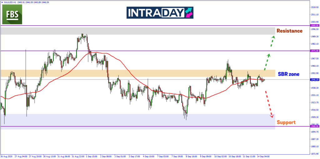 Jika diperhatikan pada carta XAU/USD, harga bergerak di sekitar zon SBR (support become resistance) 1950.00 selepas kenaikan harga minggu lalu kembali turun di bawah zon tersebut semula.