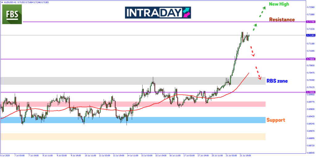 Momentum kenaikan dijangka akan berterusan dan mendorong harga naik lebih tinggi menuju paras resistance 0.71700 iaitu paras tertinggi sejak dagangan April 2019 lalu.