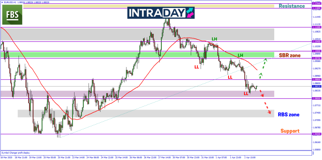 Pergerakan harga pada carta EUR/USD mencatatkan sekitar 150 pips penurunan dengan pergerakan ketara pada sesi New York sehingga harga mencecah paras terendah sekitar 1.0820 di zon RBS (resistance become support).