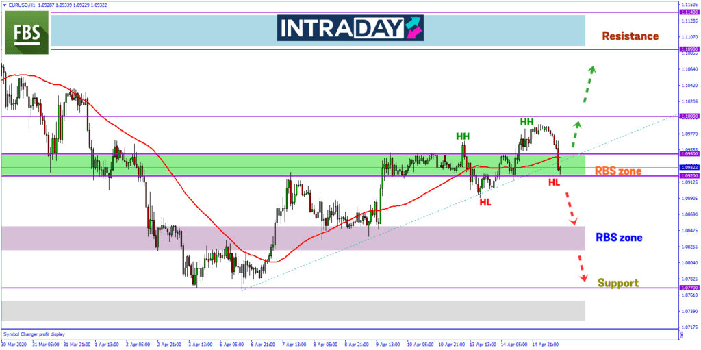 Namun pada dagangan hari ini, harga kembali membuat penurunan bermula pada sesi Asia yang lebih perlahan, penurunan diteruskan sehingga ke sesi Eropah kembali ke zon RBS (resistance become support) di sekitar 1.09200.