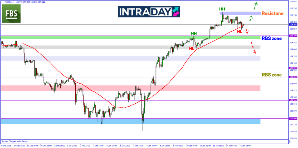 Jika penurunan berlaku, harga dilihat akan menguji semula paras 109.700 yang sebelum ini merupakan resistance pada carta USD/JPY dan kemudian membentuk zon RBS (resistance become support) yang baru.