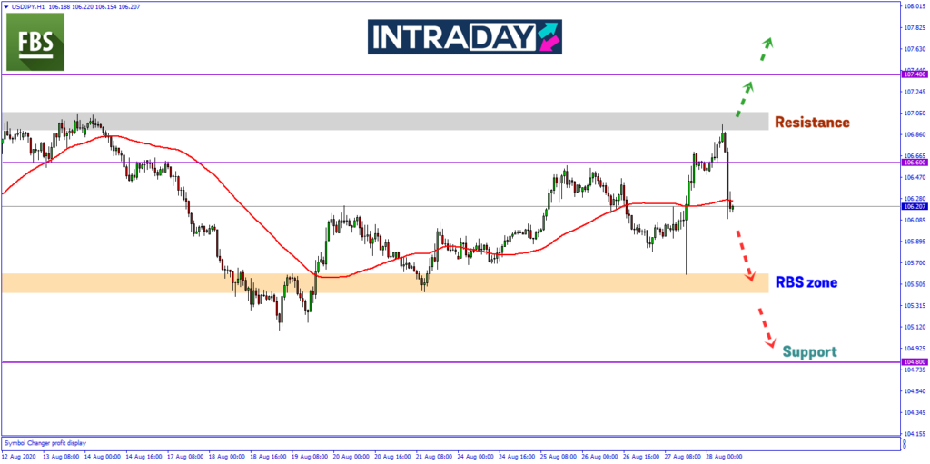 Dapat diperhatikan pergerakan harga pada carta pasangan matawang USD/JPY yang membuat kenaikan ke paras 106.900 di zon resistance kemudiannya telah menjunam sekitar 80 pips menguji semula paras sokongan Moving Average 50 (MA50) pada pergerakan 1 jam harga.