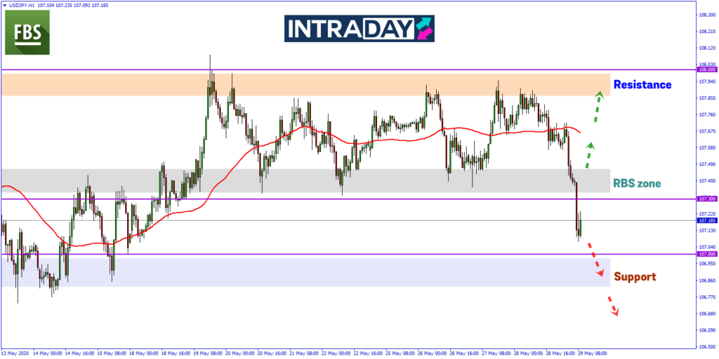 Kenaikan harga dilihat akan menuju zon SBR (support become resistance) sekitar 107.300-107.400 sebelum kembali menyambung penurunan semula.