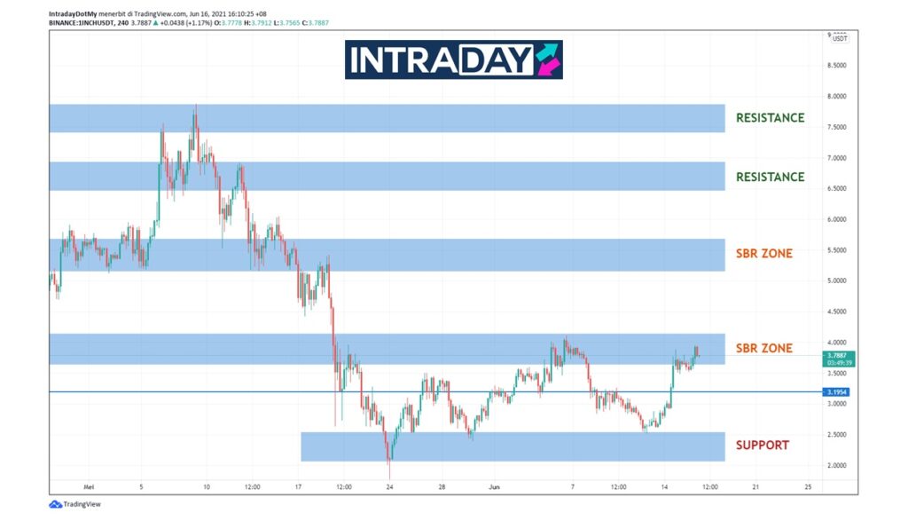 Berdasarkan kepada carta 1INCH/USDT, pada minggu lalu dapat dilihat pergerakan harga 1INCH tidak berjaya untuk mengekalkan rentak kenaikan bagi menembusi paras SBR (support become resistance) $4 sebelum kembali menyusut di atas paras sokongan sekitar $2.5.