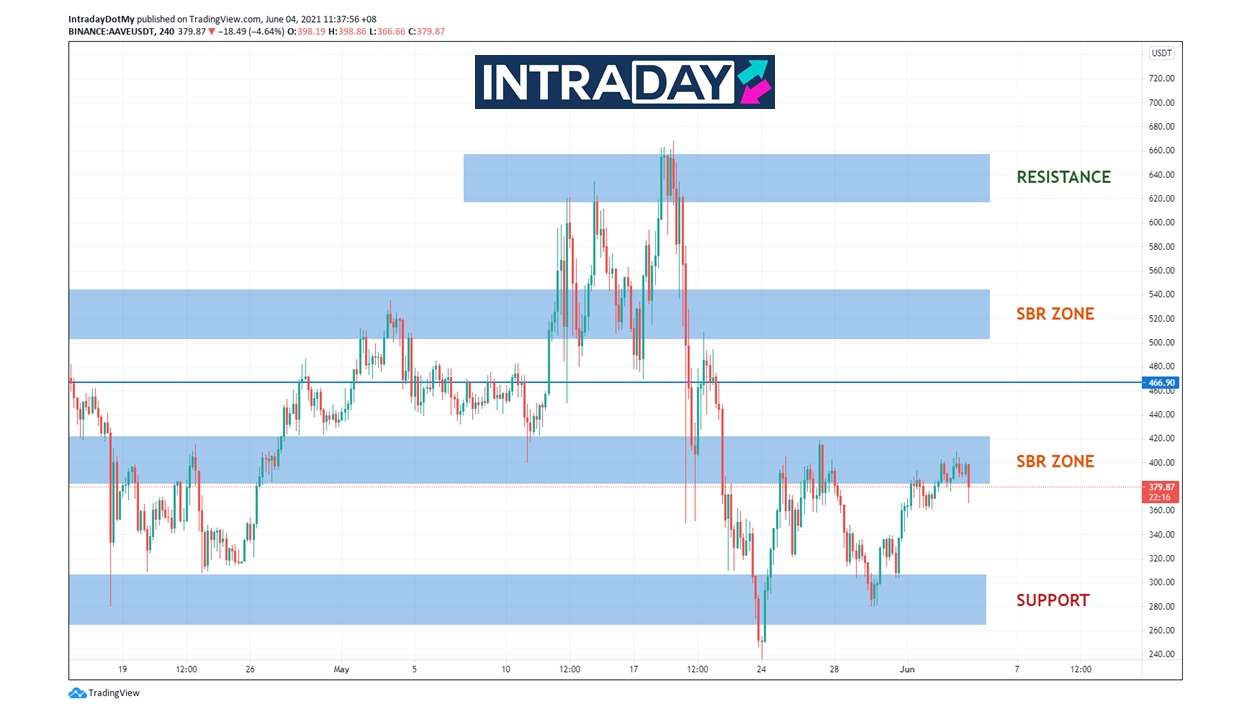 Namun tampaknya, harga AAVE gagal untuk menembusi zon SBR (support become resistance) sekitar harga $400 dan seterusnya menyambung semula penurunan. Kejatuhan ini juga selaras dengan kejatuhan nilai Bitcoin yang masih lagi gagal untuk menembusi paras harga $40,000.