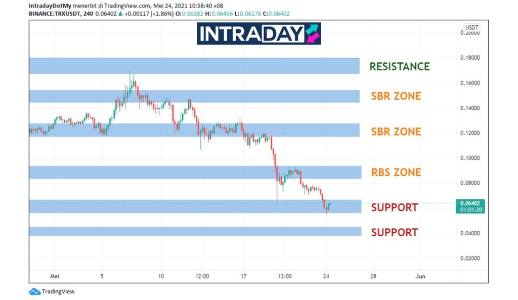 Sekiranya pergerakan harga TRX dapat menembusi paras rintangan $0.093, sasaran kenaikan seterusnya adalah zon SBR (support become resistance) sekitar harga $0.11 – $0.12 untuk diuji.