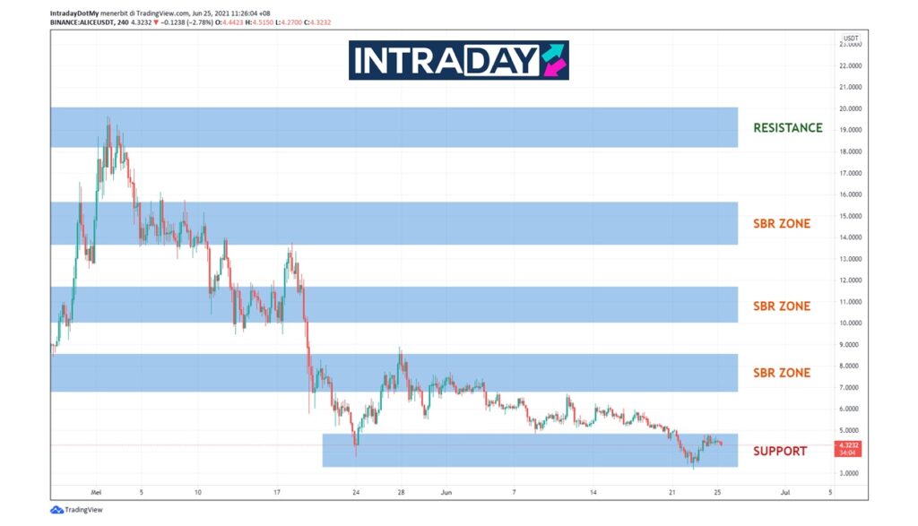 Jika harga ALICE kembali membuat lonjakan, paras SBR (support become resistance) sekitar $7-$8 bakal menjadi paras utama utama untuk diuji yang mana paras harga $8 merupakan paras yang paling sukar untuk ditembusi.