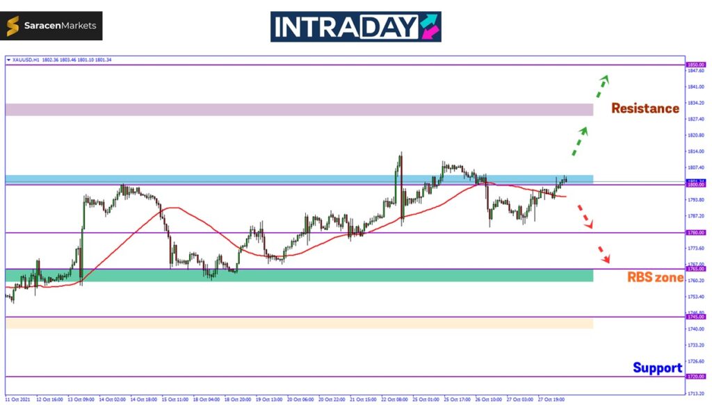 Namun jika US dolar berjaya mengukuh dan memberi tekanan semula kepada emas, harga boleh susut semula dari zon 1800.00 dan menguji zon sokongan 1780.00.