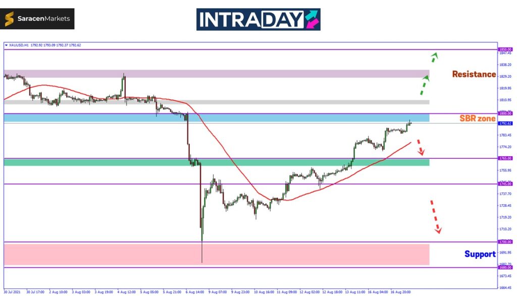 Bersambung pada dagangan Selasa, harga masih meneruskan kenaikan menuju ke paras 1800.00 untuk kembali menguji zon SBR (support become resistance) tersebut.