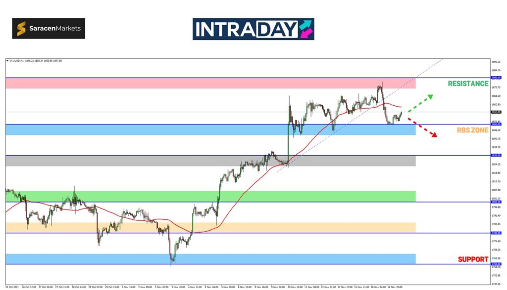 Akan tetapi zon RBS 1850.00 itu diperhatikan ketika ini sedang membantu harga emas untuk kembali meningkat yang berkemungkinan akan berlaku ‘reversal’ di trendline support sebelum terus menjunam.