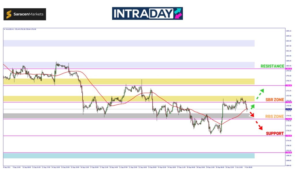 Namun sekiranya harga pada carta XAU/USD menyangkal trend kenaikan yang dipamerkan pada ketika ini, harga dijangka akan menguji zon RBS (resistance become support) 1740.00.