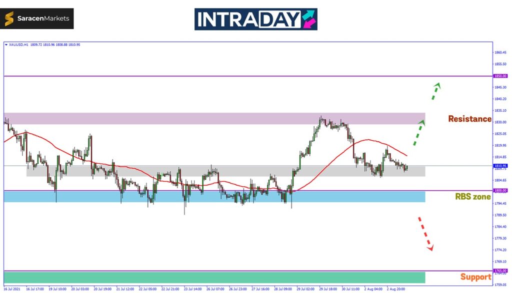 Melepasi zon tersebut akan mendorong kenaikan harga emas lebih tinggi menuju zon SBR (support become resistance) tumpuan pada 1850.00.
