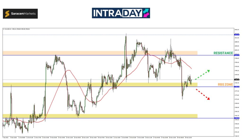 Meninjau kepada carta harga XAU/USD yang mengukur nilai emas berbanding USD dilihat turut mempersembahkan aksi terjunan sehingga lah menembusi zon RBS (resistance become support) pada 1780.00.