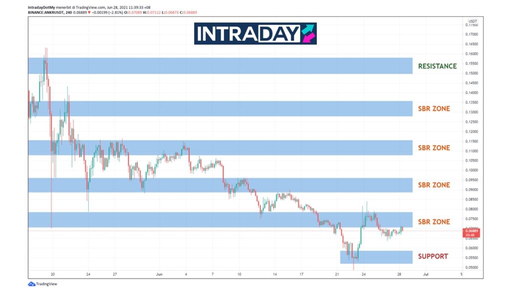 Jika diteliti pada carta pergerakan harga ANKR/USDT, harga ANKR kelihatan masih berlegar-legar dan bergerak perlahan di bawah paras SBR (support become resistance) $0.075 setelah melonjak daripada paras sokongan sekitar $0.055.