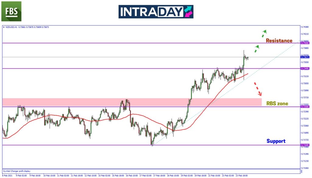 Namun pada sesi Asia pagi ini, harga menguji paras sokongan Moving Average 50 (MA50) pada rangka masa 1 jam sebelum meneruskan kenaikan melepasi rintangan 0.73400 susulan keputusan mesyuarat RBNZ.